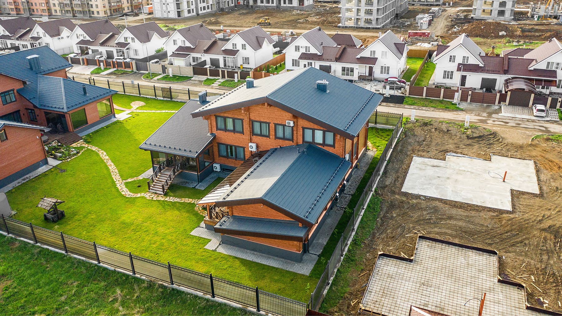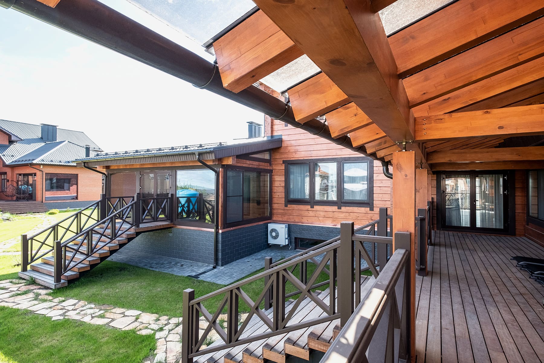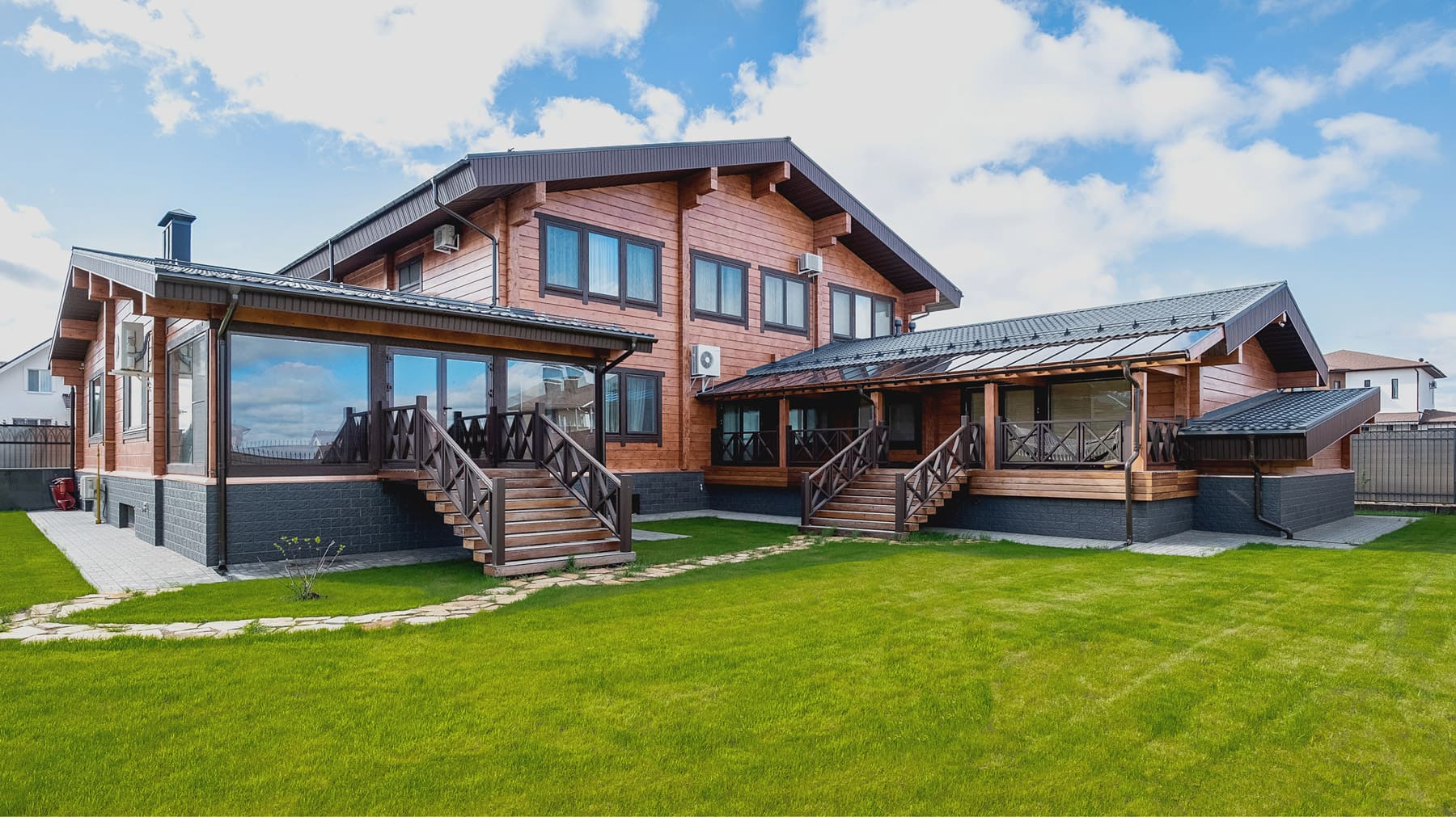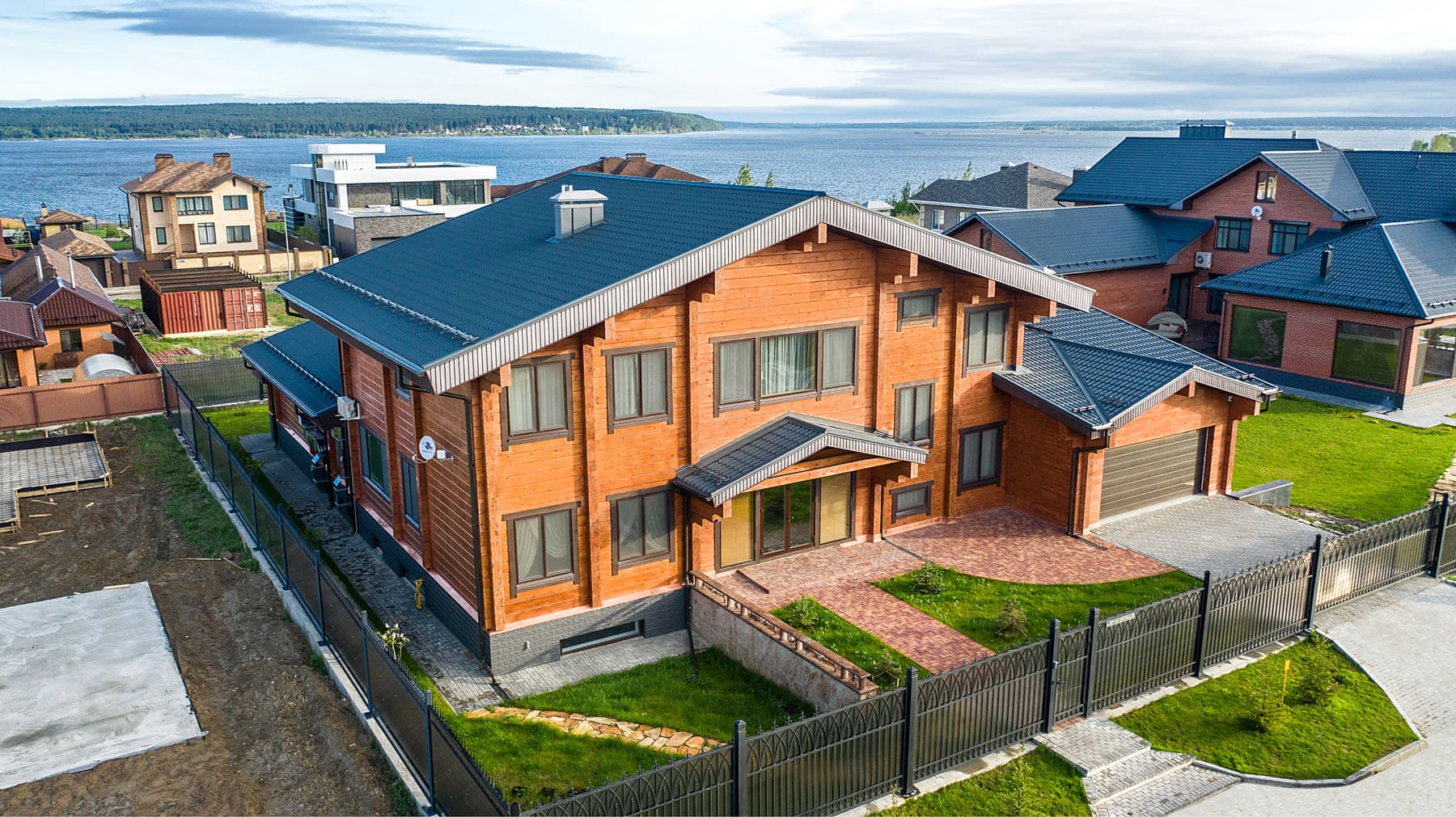 Дом выглядит фундаментально и масштабно, имеет классическую отделку - фасады выкрашены в натуральные цвета дерева, темно-серая финская металлическая кровля и цоколь, отделанный декоративным камнем. Все это подчеркивает высокий статус владельцев и выделяет дом на фоне остальных построек.