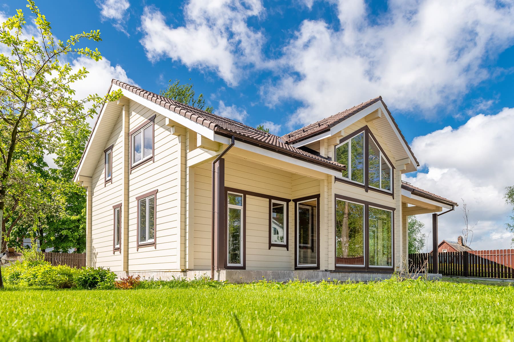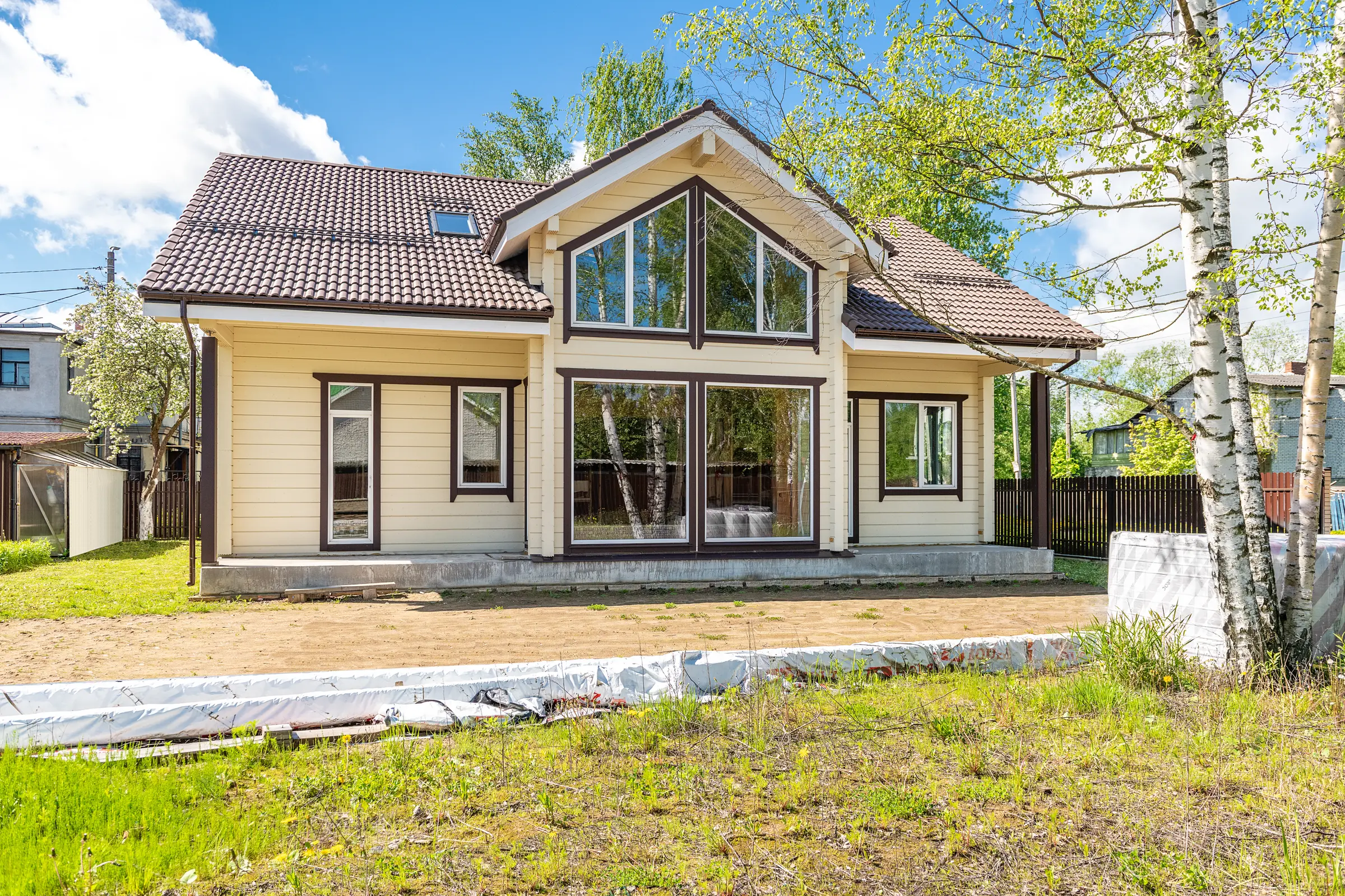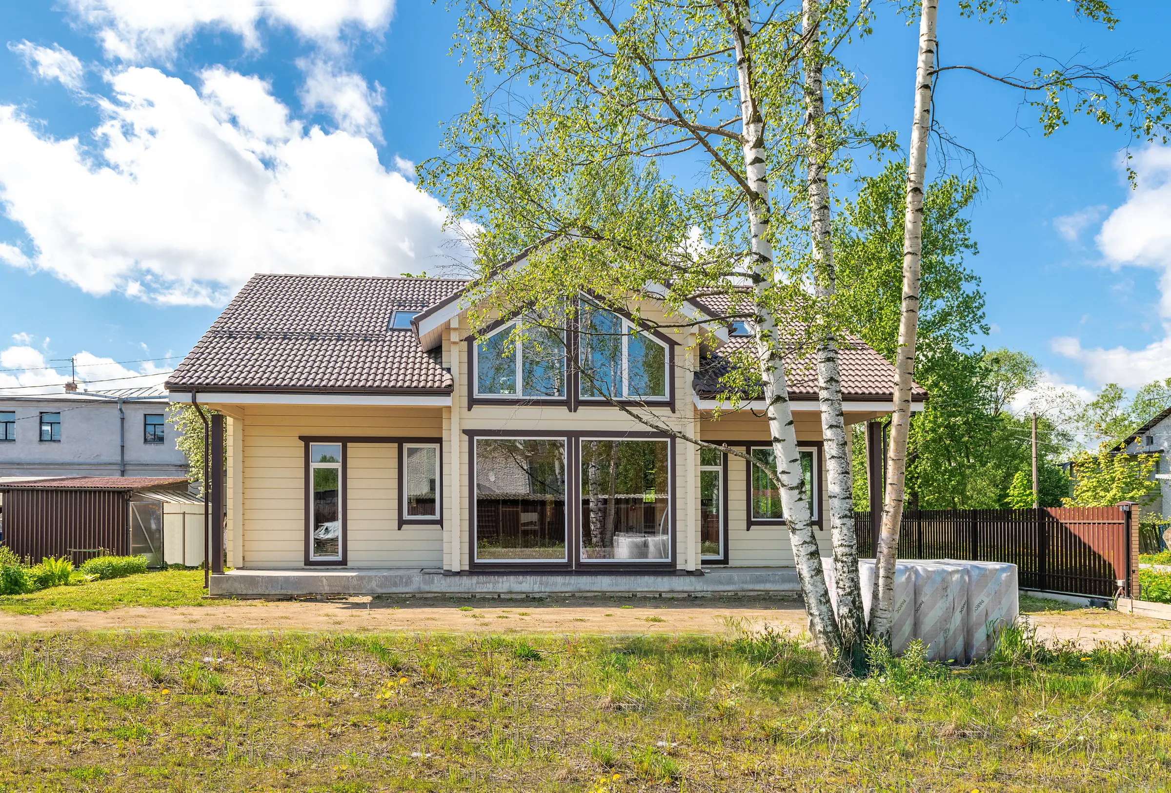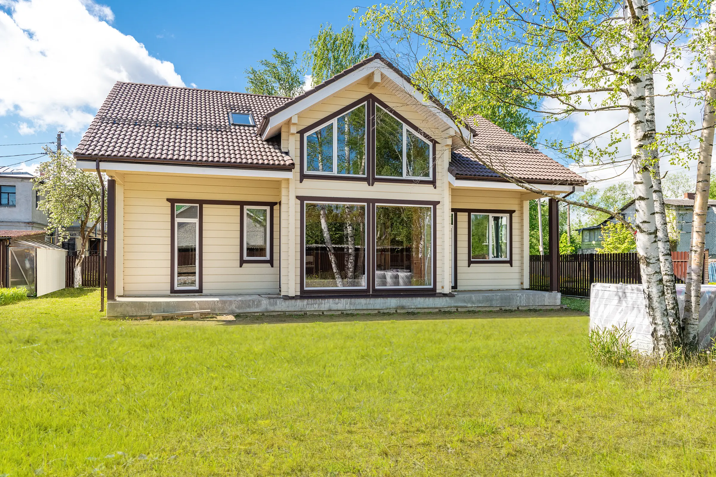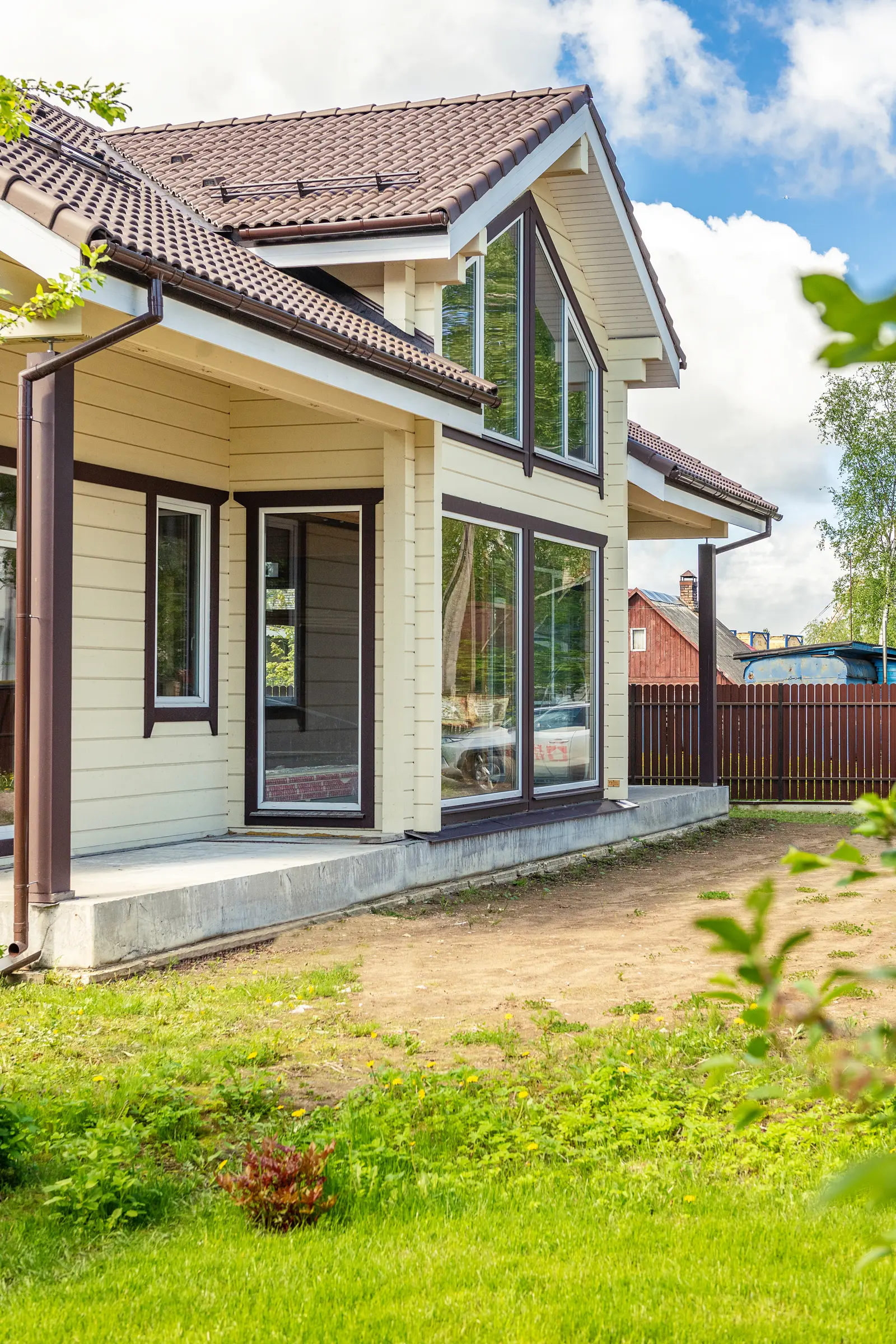Высокая двускатная кровля, покрытая черепицей, смотрится стильно и эстетично, привлекая к себе внимание и перекликаясь по цвету с такими же шоколадными наличниками окон. Простая прямоугольная конструкция здания дополнена роскошным выступающим эркером с панорамными окнами в два этажа и стеклянными дверями на входе.