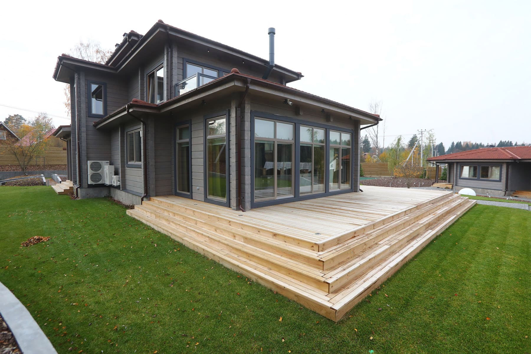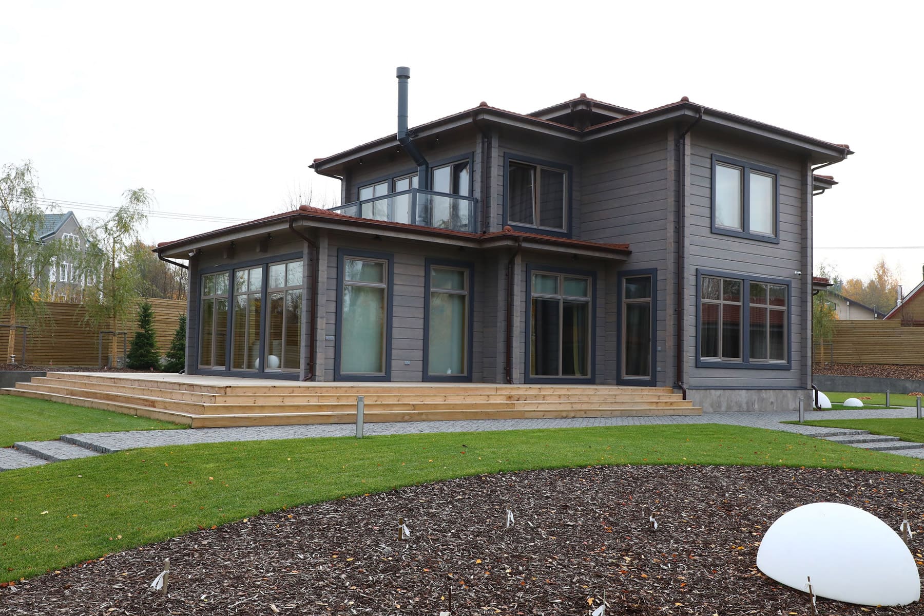 В строгой лаконичности фасада и минималистичной эстетике здания угадывается влияние стиля модерн. Такой дом из клееного бруса смотрится свежо, оригинально и внушительно, привлекая внимание идеальными геометрическими пропорциями и элегантным дизайном.