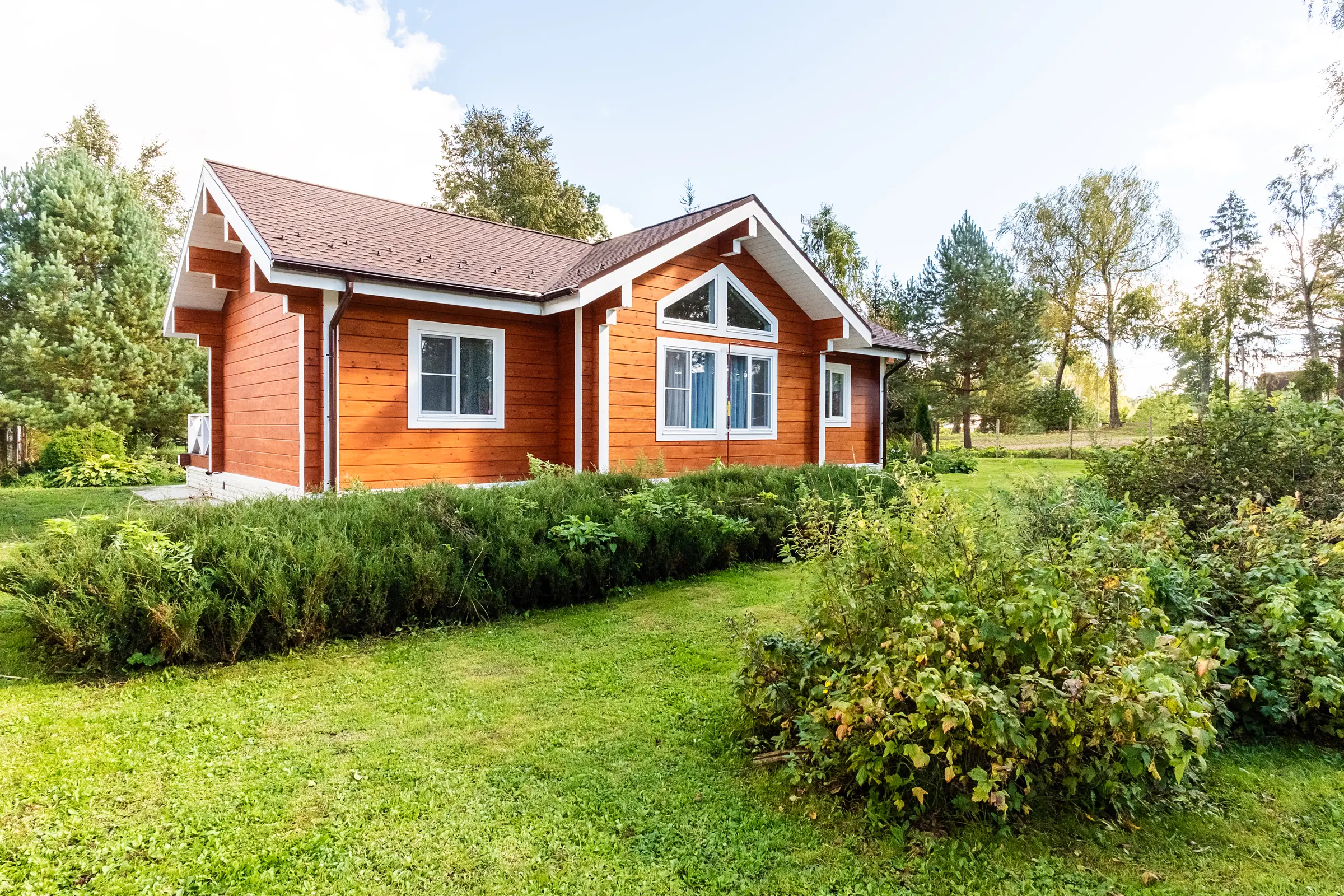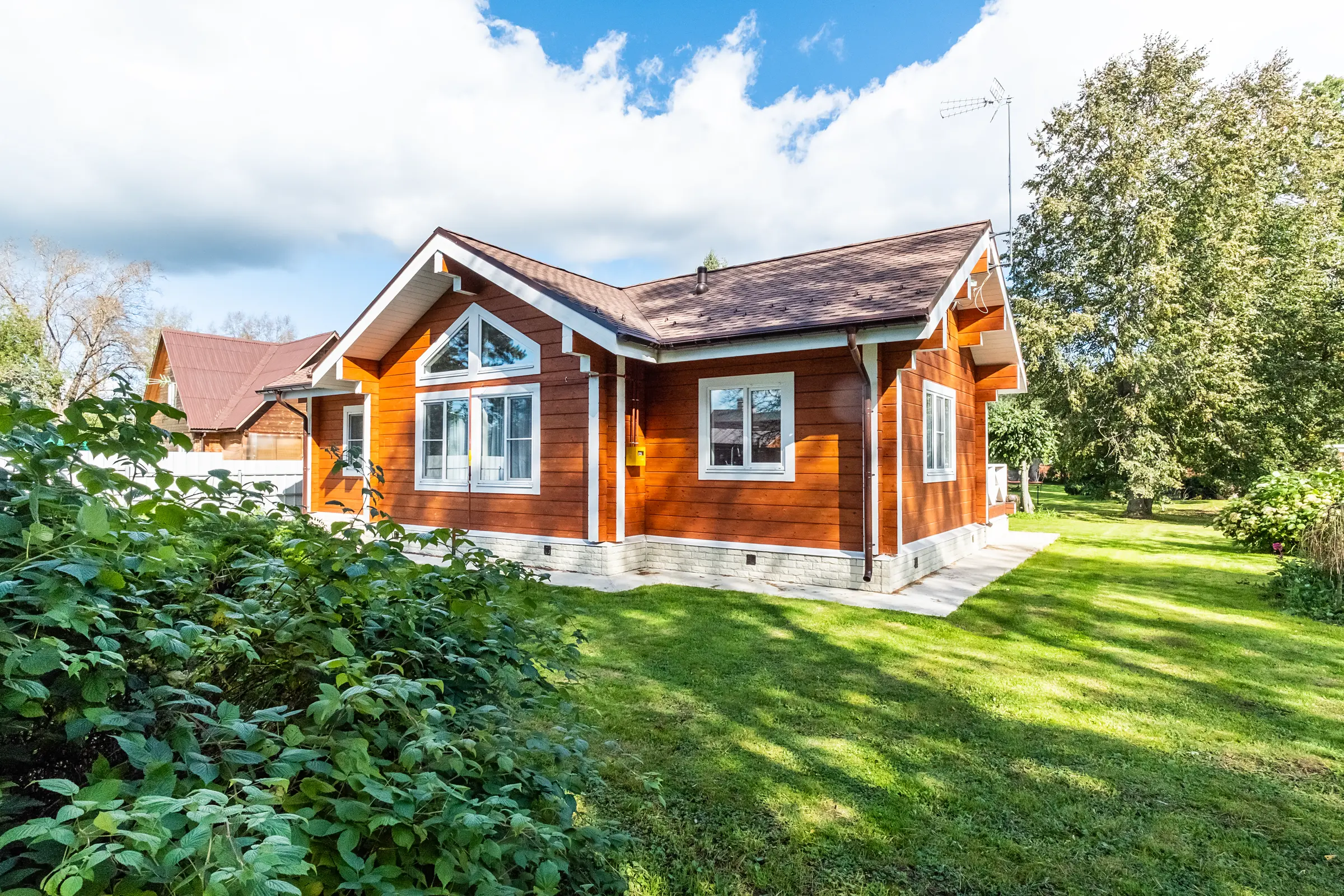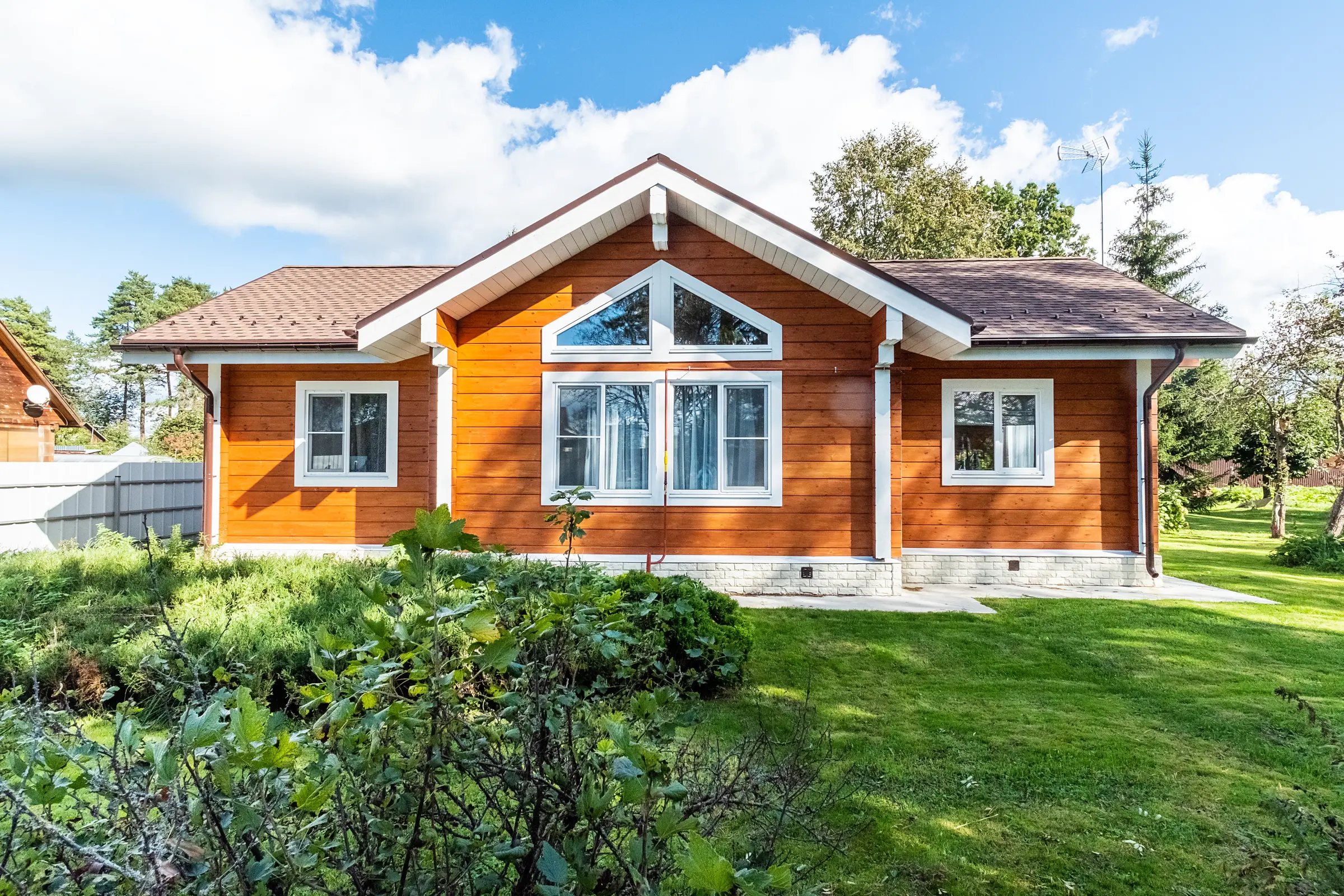 Экстерьер здания радует цветовыми контрастами: насыщенный оранжевый становится фоном для белоснежных наличников, фундамента и окантовки. Сочные цвета фасадов великолепно сочетаются с зеленью лужайки, но и зимой такой дом будет выглядеть живописно. Четкая симметрия конструкции и строго очерченные белым цветом линии создают законченный облик опрятного и ухоженного загородного коттеджа.