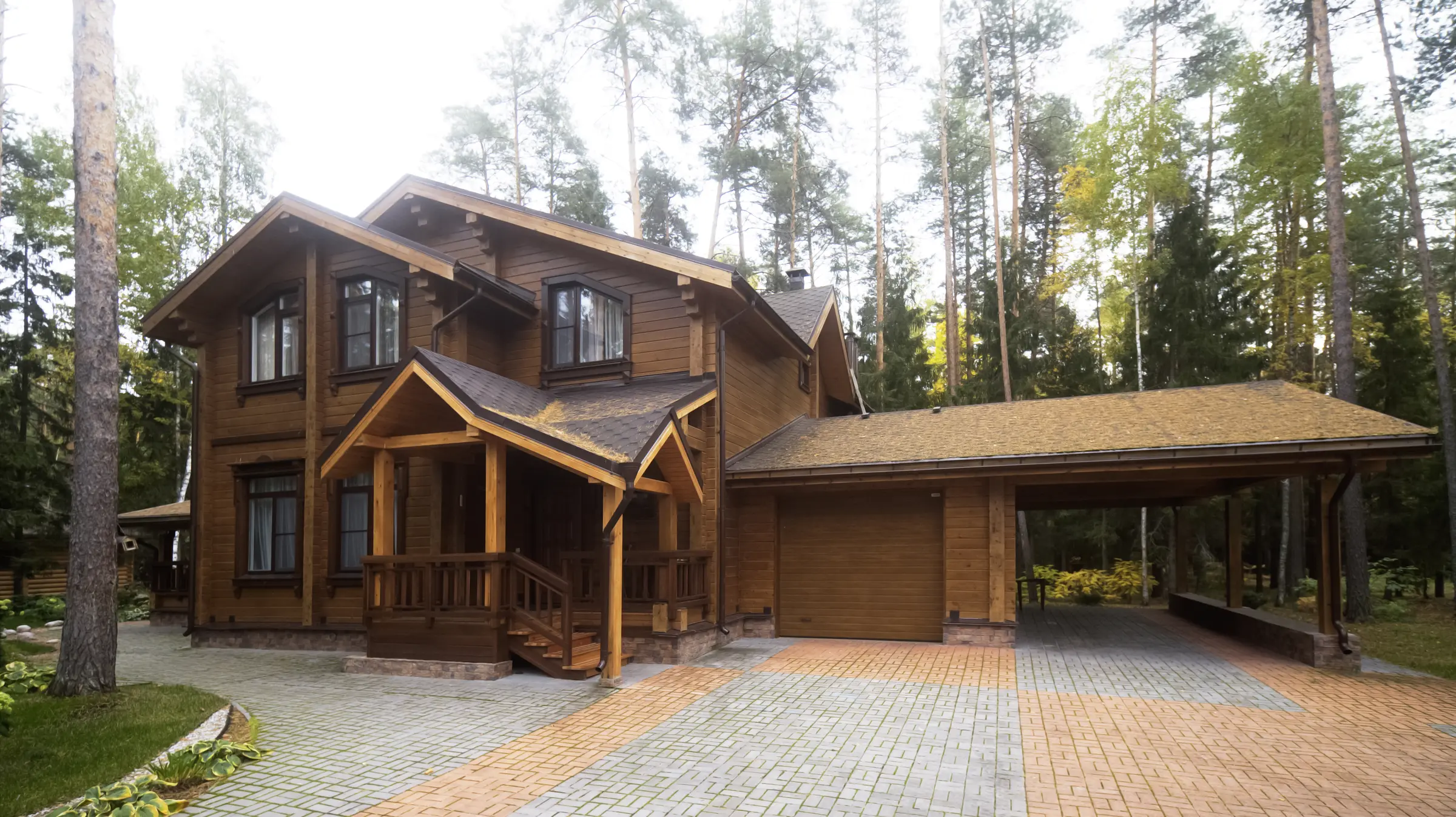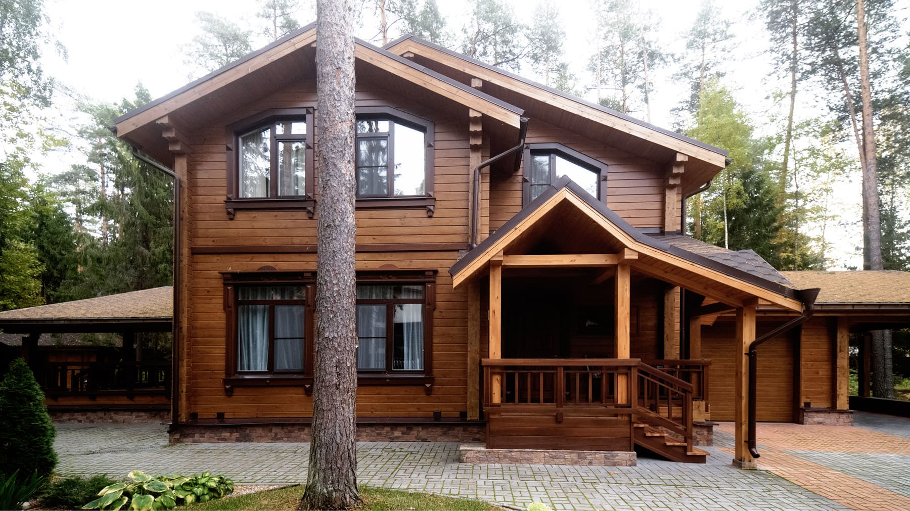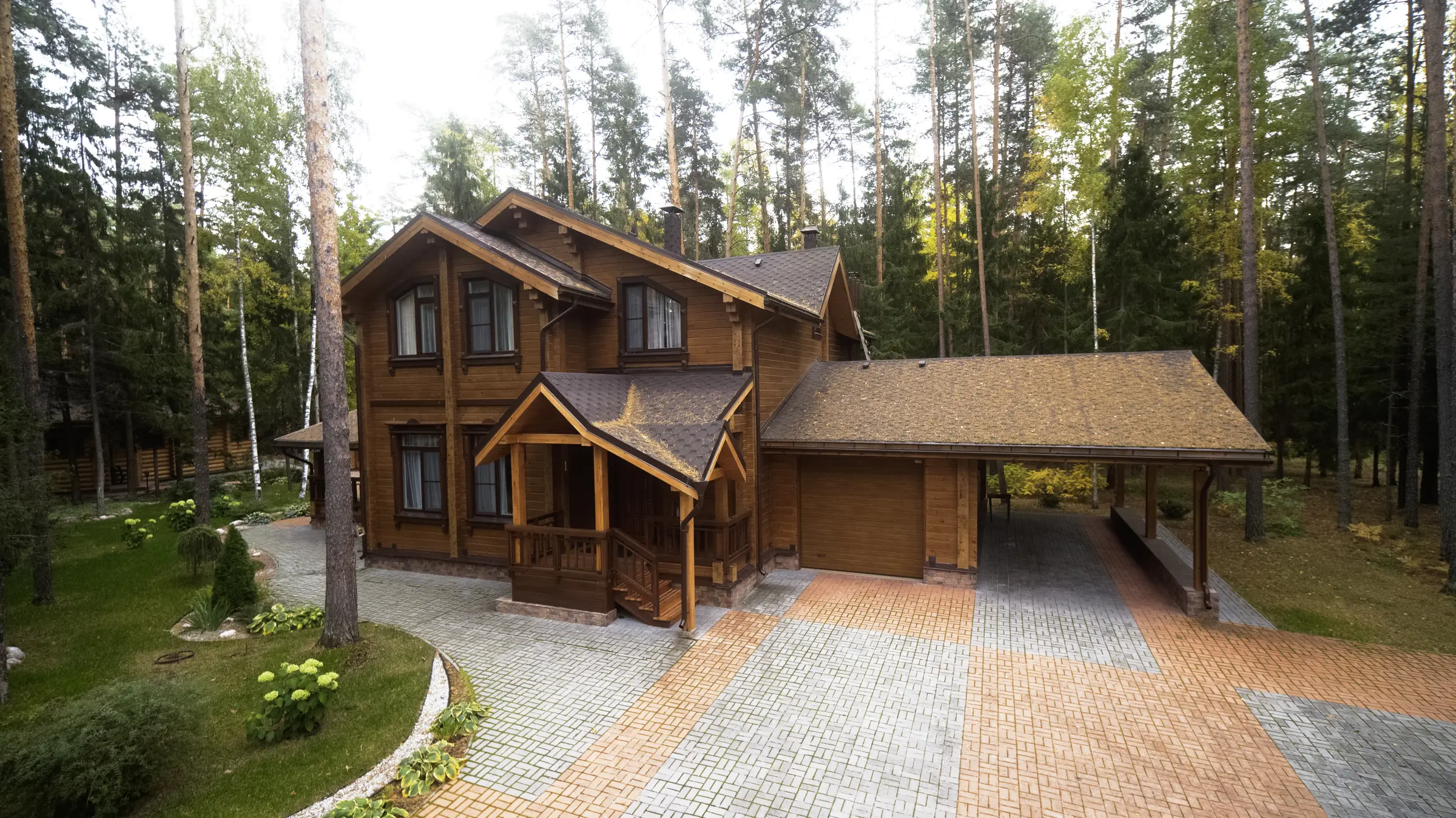 Максимально приближенный к лесному ландшафту и вписанный в окружающую среду, дом из клееного бруса по проекту «Тампере» - словно живописная русская усадьба, выросшая посреди лесного массива и надежно укрывшая своих жильцов от суеты внешнего мира. Дух старины и веяние традиционного русского зодчества умело соседствуют с современным стилем архитектуры.