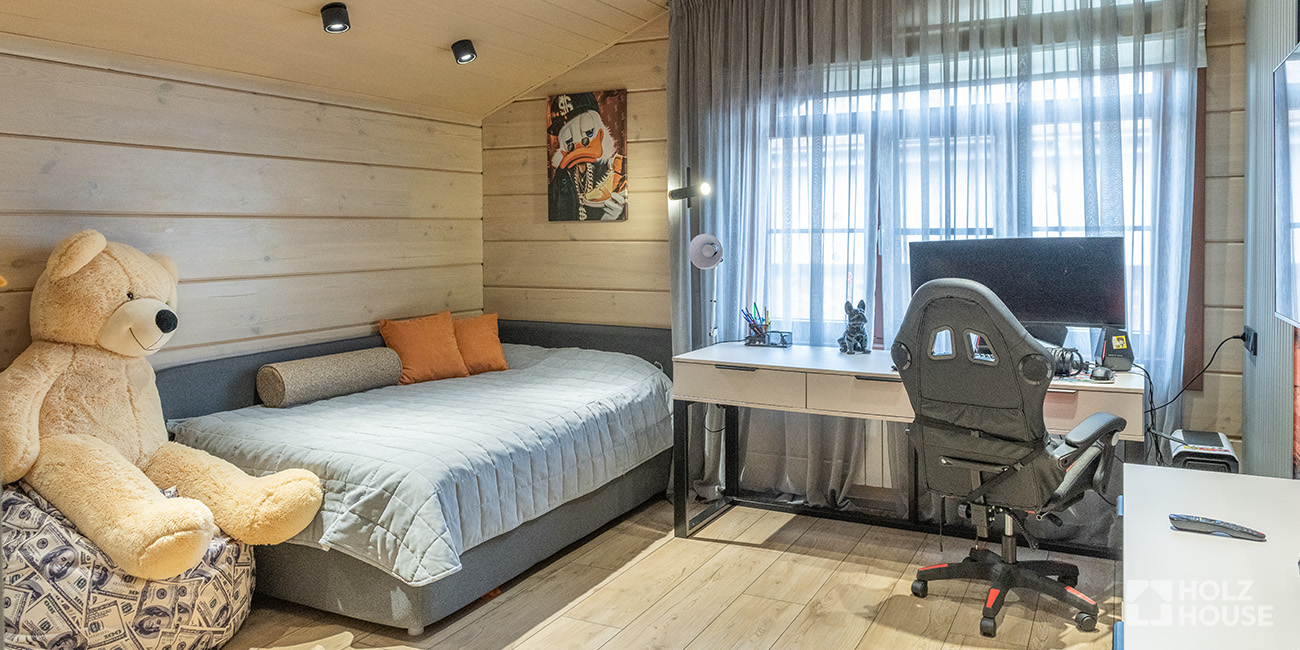 Наш многолетний опыт строительства домов из клееного бруса показывает, что возможности мансарды позволяют создать невероятно уютное пространство для детской благодаря уникальной атмосфере, которая стимулирует воображение, и экологичным свойствам древесины, поддерживающим здоровый микроклимат. Исследования показывают, что дети, которые растут в доме из клееного бруса, реже болеют и не страдают от аллергии, так как воздух в помещениях не содержит токсичных компонентов, а полезные фитонциды, вырабатываемые древесиной хвойных пород, обеззараживают воздух, нейтрализуют бактерии и вирусы, а также благотворно влияют на здоровье.