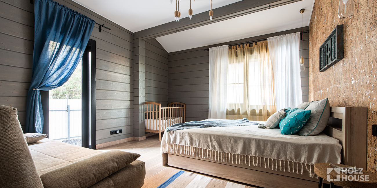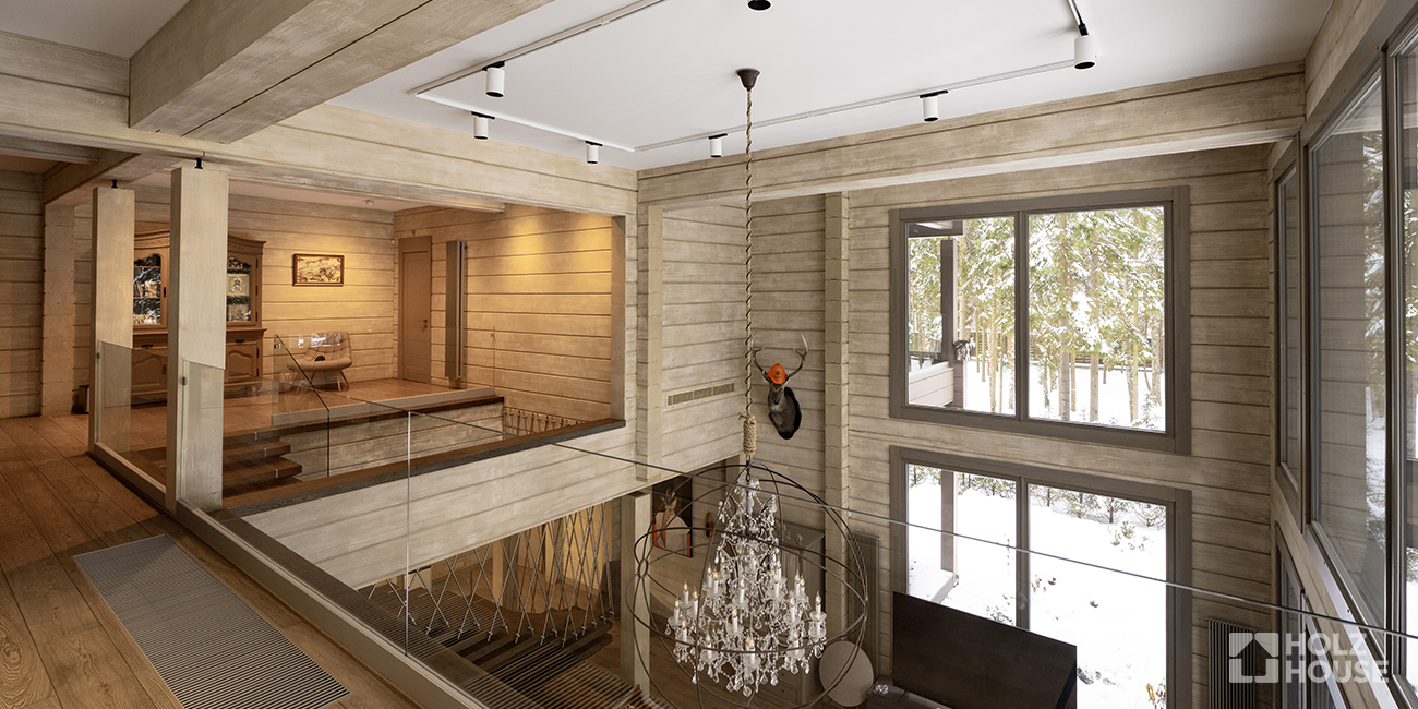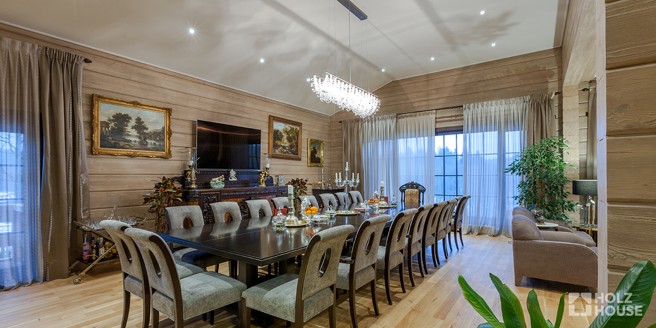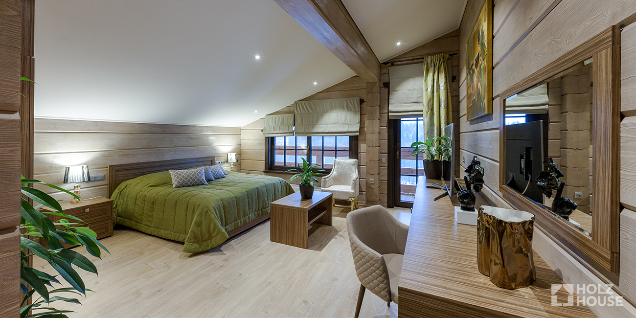 Эксперты Holz House советуют: в домах из клееного бруса с выразительной текстурой стен лучше выбирать спокойные, нейтральные тона для потолка. Пусть дерево остается главным акцентом интерьера.